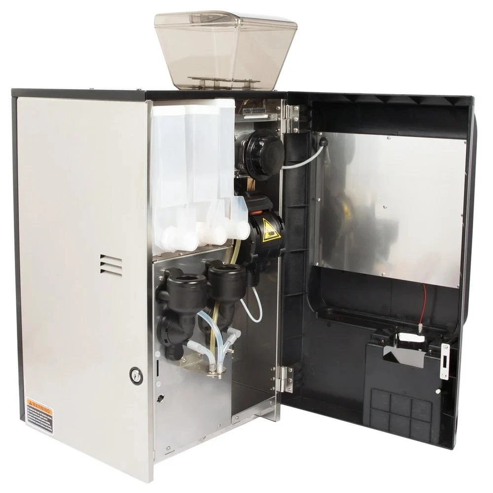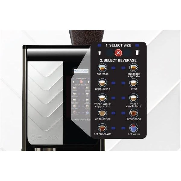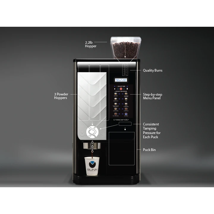 The ideal serving temperature of espresso and café beverages is achieved with Bunn’s independently controlled two-tank system. Three powder hoppers work together to deliver a wide range of flavors: two 3.3lb hoppers for the larger demand flavors and a third 2.2lb hopper for French Vanilla.