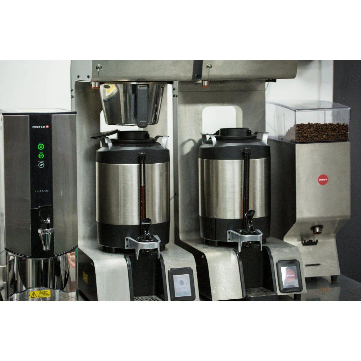 Delivers coffee directly into two portable urns. The operator sets recipes and batch volume requirements. Basket safety lock during brewing. Automated, intelligent grinder. Easy to operate with minimal operator error. Cost-per-cup control, temperature accuracy, and energy-efficient. Back-to-back brewing. Urns and grinders are sold separately.