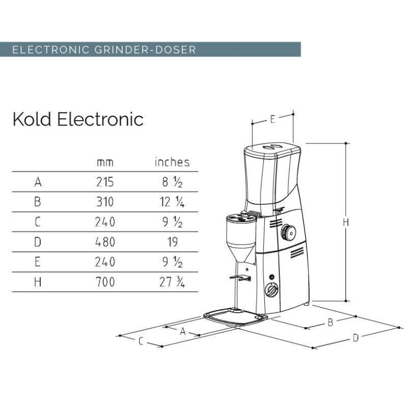 Kold S electronic is an electronic grinder-doser with a belt-driven transmission, conical grinding blades, and slow speed rotation suitable for high consumption.