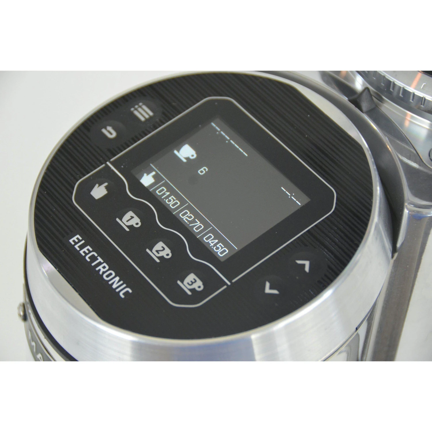 - Electronic grinder with conical grinding blades and slow speed rotation suitable for high consumption