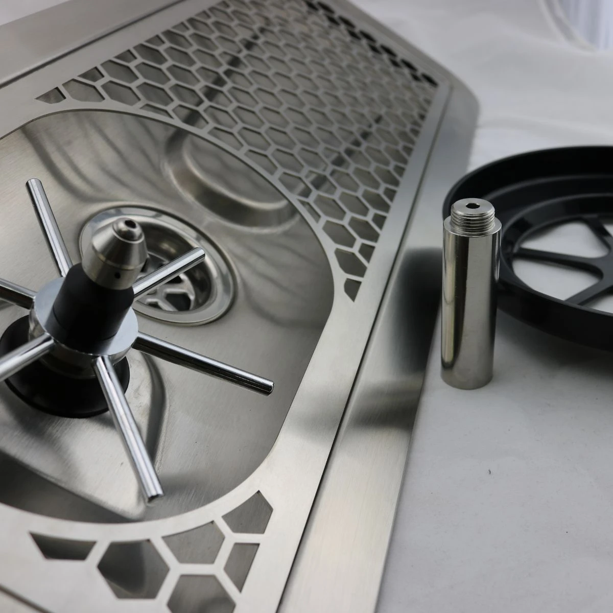 - Do not cut out benchtop surfaces prior to receiving your rinser: Due to slight variations in manufacturing design and the varying requirements of bench materials, it is strongly recommended to have the physical vessel rinser on hand prior to cutting into benchtop surfaces. Bombora Supplies does not take responsibility for errors concerning installation and provides the sizes and dimensions as a layout guide only.