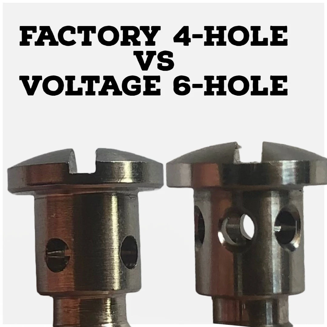 - Unlike the factory 4 hole screw, every hole on the Voltage 6 hole diffuser screw has been chamfered to remove sharp edges in effort to produce a symmetrical sloping edge that maximizes water flow