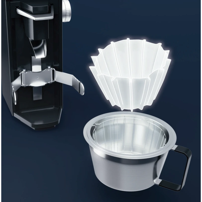 - Height- and width-adjustable filter basket support suitable for any common filter basket size and shape