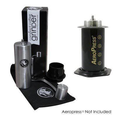 The Rhino Coffee Gear compact hand coffee grinder includes an adapter so you can grind straight into an AeroPress®. This grinder is a great solution for grinding coffee on the go – for travel, work, or even just at home.